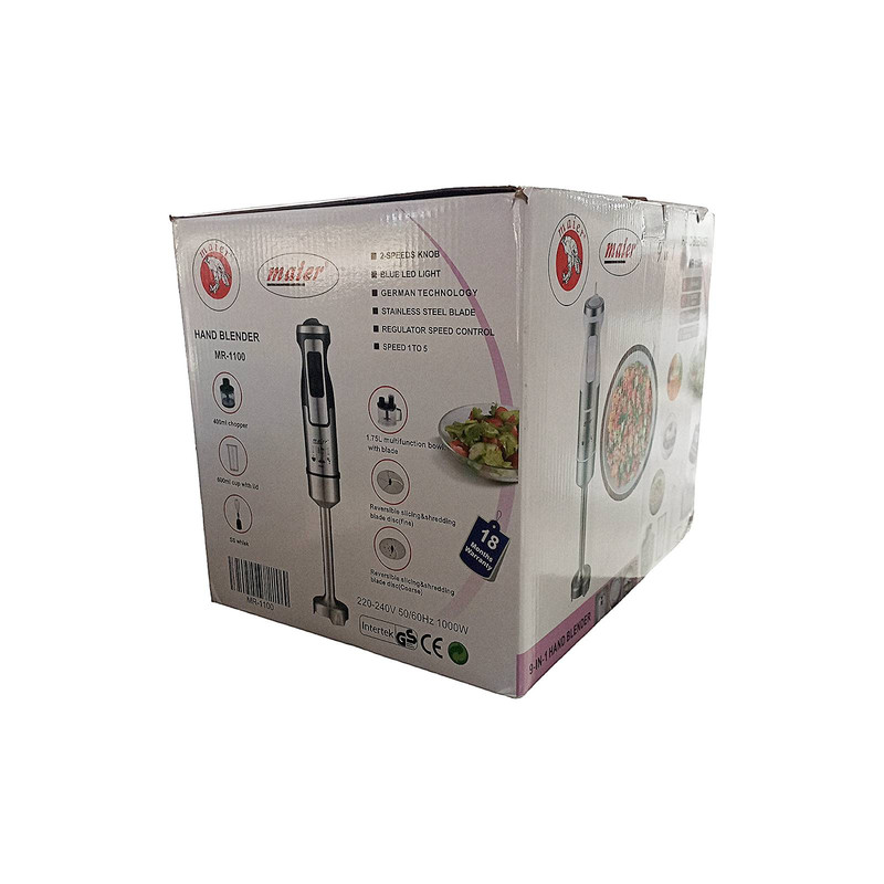 گوشت کوب 9 کاره مایر مدل MR-1100 از یک گوشت کوب میله ای ، یک ظرف غذاساز با تیغه و صفحه استیل ، یک پارچ و یک همزن پره ای استیل تشکیل شده است. این دستگاه می تواند تمامی مواد سفت و نرم، سرد و داغ را در عرض چند دقیقه بطور کامل به مخلوطی یکدست تبدیل کند.علاوه بر آن کاسه غذاساز این دستگاه طراحی شده که یک درب پلاستیکی بسیار مقاوم روی آن قرار می گیرد. بر روی درب این غذا ساز یک لوله نسبتا بزرگی تعبیه شده که از طریق آن به راحتی می توان مواد را درون مخزن ریخت و در عرض چند دقیقه بطور کاملا یکدست خرد و مخلوط کرد. درضمن جهت ثبات و استحکام بیشتر یک نوار لاستیکی دور تا دور کف کاسه بکار رفته شده تا در حین استفاده ظرف به هیچ عنوان سر نخورد و سرو صدا ایجاد نکند که این هم یکی از ویژگی های مهم دستگاه بشمار می اید.تمامی قطعات این دستگاه به جز بدنه اصلی را می توان داخل ماشین ظرف شویی شستشو کرد. برای له کردن و خرد کردن انواع میوه ها و سبزیجات ، مخلوط کردن ، به هم زدن انواع مواد و حتی پودر کردن استفاده کرد.مناسب برای خرد کردن سبزیجات ,آجیل , پیاز ,گوشت , پنیر و …می باشد.این محصول از جنس فولاد ضد زنگ است که مقاومت بسیار بالایی دارد.از تیغه های فوق العاده تیز برخوردار است که به راحتی می تواند هر نوع ماده غذایی را برش دهد یا خرد کند.موتور این گوشت کوب از موتوری بی صدا بهره می برد که قدرت 1000 وات را به آن می بخشد.با کمک نوار پلاستیکی که دور تا دور کف دستگاه کشیده شده است در زمان کار شما هیچ گونه لرزش یا سروصدایی را نمی بینیدکه امتیازی بسیار عالی برای این گوشت کوب چندکاره محسوب می شود.